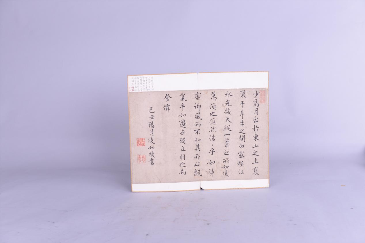 此册页为许承尧收藏,纵34.8厘米,横41.2厘米,左上有许承尧题跋:凌恕斋字榆山沙溪人,康熙四十七年进士,视学湖北,历官内阁学士至兵部左侍郎乞养归。质直敢言,见歙志官迹。钤“芚父所得”朱文方印。册页正文内容为:少焉,月出于东山之上,徘徊于斗牛之间。白露横江,水光接天。纵一苇之所如,凌万顷之茫然。浩浩乎如冯虚御风,而不知其所止;飘飘乎如遗世独立,羽化而登仙。已丑阳月凌如焕书。钤“凌如焕印”“恕斋”“迩延野绿 远混天碧”朱文方印。