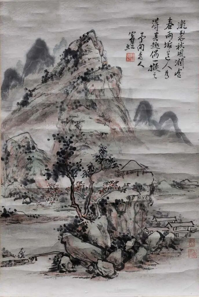 此图画面绘远山、小桥、行人、房屋,采用干枯皴擦笔法,意境高远。右上题:“干裂秋风,润含春雨,垢道人为得其趣,偶一拟之”。落款:“予向老人,宾虹”,下钤“黄宾虹”白文方印。右下角有“曹一尘印”收藏印。是一件宾老仿新安画派著名画家程邃的精品力作。