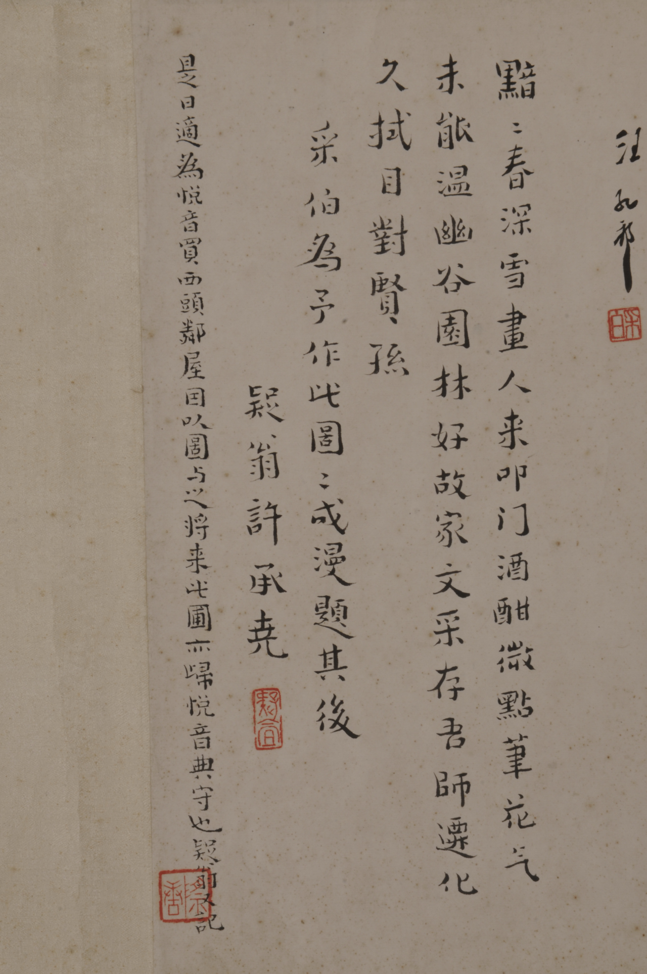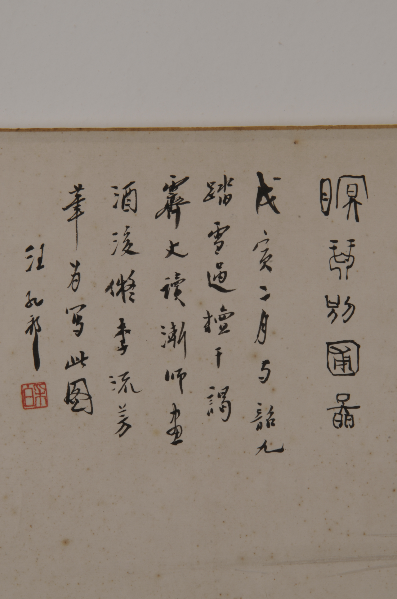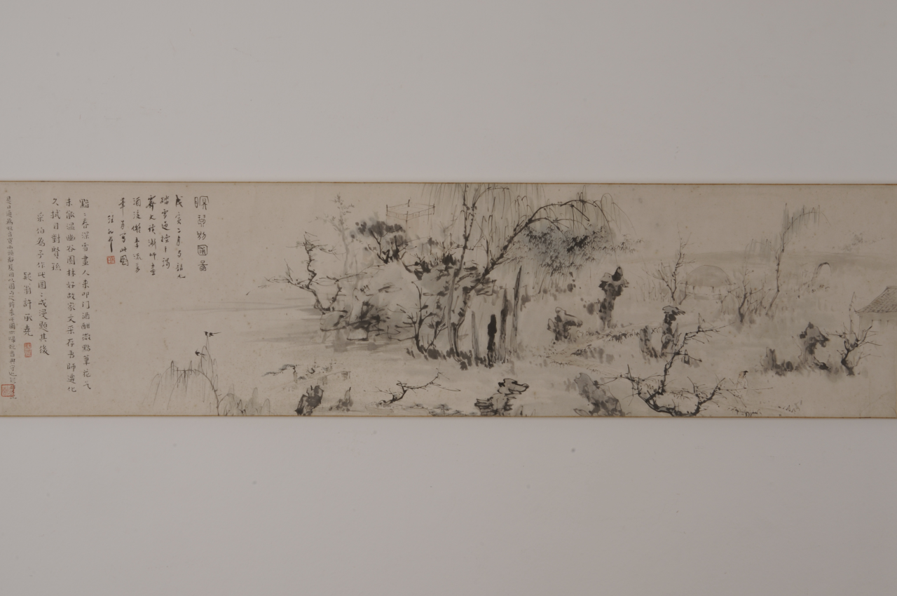 汪采白(1887—1940),名孔祁,字采白,一字采伯,号澹庵、洗桐居士,安徽歙县人。《瞑琴别圃图》手卷为汪采白52岁时所作,纵34厘米,横130厘米。画上题款:“瞑琴别圃图。戊寅二月,与韶九踏雪过檀干,谒霁丈,读渐师画,酒后仿李流芳笔为写此图。汪孔祁。”钤“采白”朱文印。后有许承尧题跋:“黯黯春深雪,画人来叩门。酒酣微点笔,花气未能温。幽谷园林好,故家文采存。吾师迁化久,拭目对贤孙。采伯为予作此图,图成漫题其后。疑翁许承尧。”再题:“是日适为悦音买西头邻屋,因以图为之,将来此圃亦归悦音典守也,疑翁又记。” 供稿:徐欣仪 编辑:夏雨欣 二审:王卫东 终审:周虎