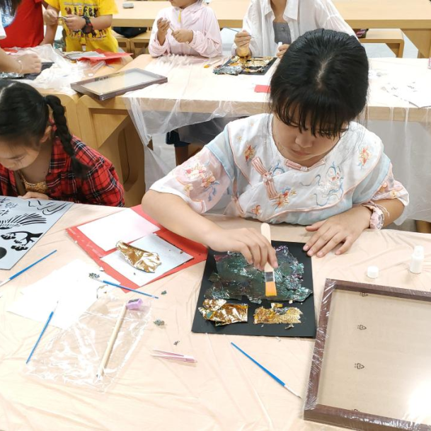 在实践体验环节,社教老师循序渐进地演示了烧箔画的完整制作流程。从图案设计到涂胶定位,再到金箔贴附,每个步骤都体现了传统工艺的精妙之处。参与者们专注聆听,细心操作,在亲手实践中体会工匠精神。当一张张金箔在精心制作下化作流光溢彩的艺术作品时,传统技艺的现代生命力得到了完美展现。
